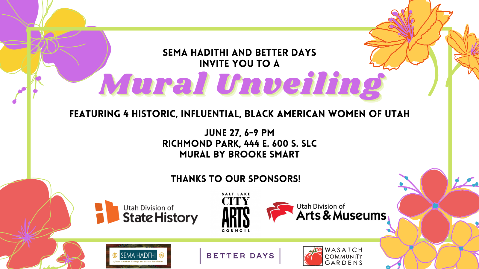 Join Sema Hadithi, Better Days, and Wasatch Community Gardens for a mural unveiling at Richmond Park! The mural, by Brooke Smart with a community-driven design process, depicts 4 Black women who lived and worked the neighborhood at different points in Utah history. The finished creation will be unveiled at 6 pm on June 27 as the last event of the official Juneteenth Utah celebrations. After the unveiling ceremony, storytellers and displays will share the legacies of these influential women who have shaped the place we call home.