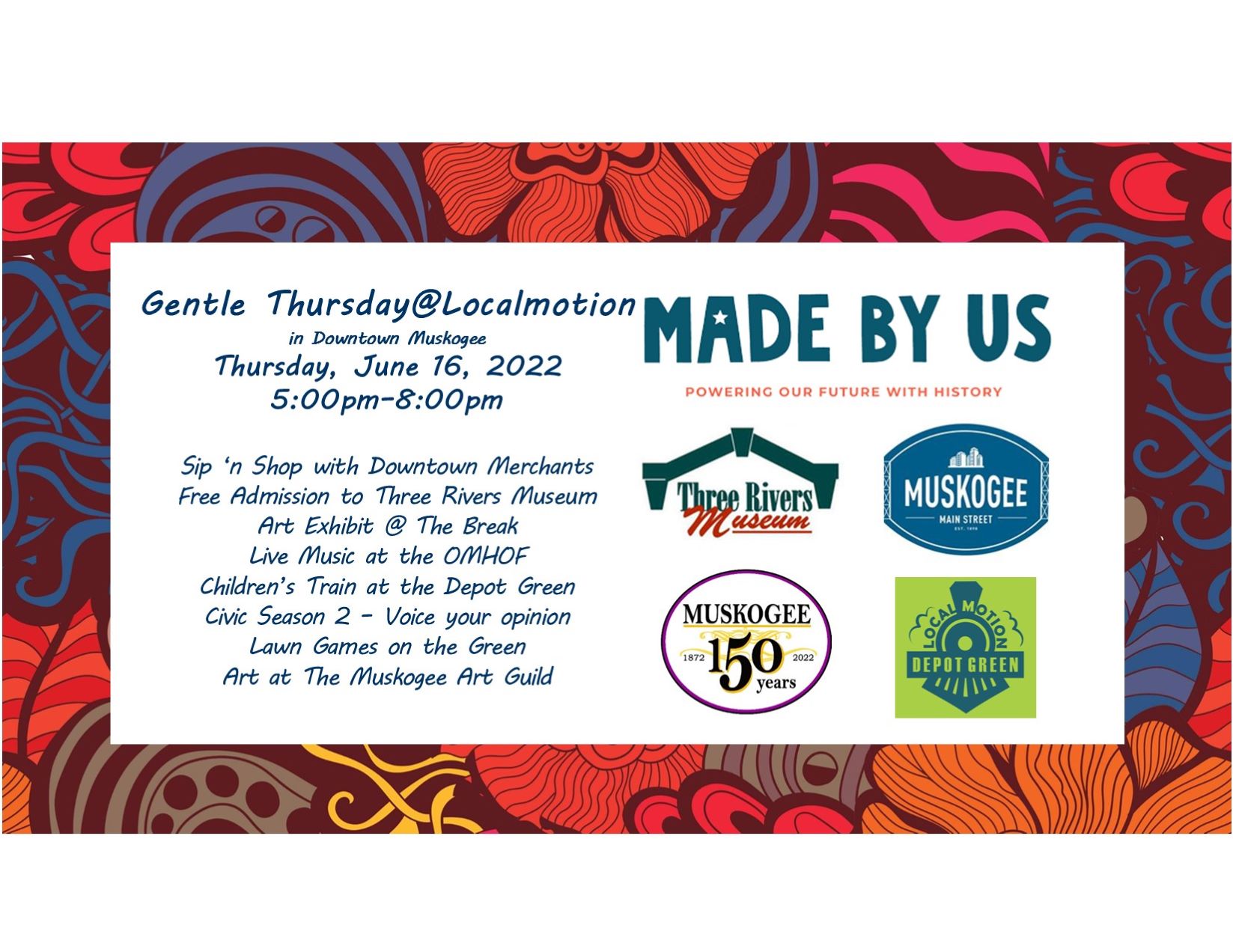 Gentle Thursday@Localmotion is a festival on the Depot Green in Downtown Muskogee that is designed to engage young people and their families in civics investigations. On the Depot Green people can play lawn games, enjoy food trucks, and live music while also participating in voting simulation and chalk-the-block type activities. An art show highlighting the questions, “What does America mean to you,” “How do you show your patriotism,” “Why should we vote,” or “How do you engage with our democracy?” will be held at a coffee bar located at the Green. People’s Choice art awards will be given at the end of the evening. We will also have a special exhibit at Three Rivers Museum.
