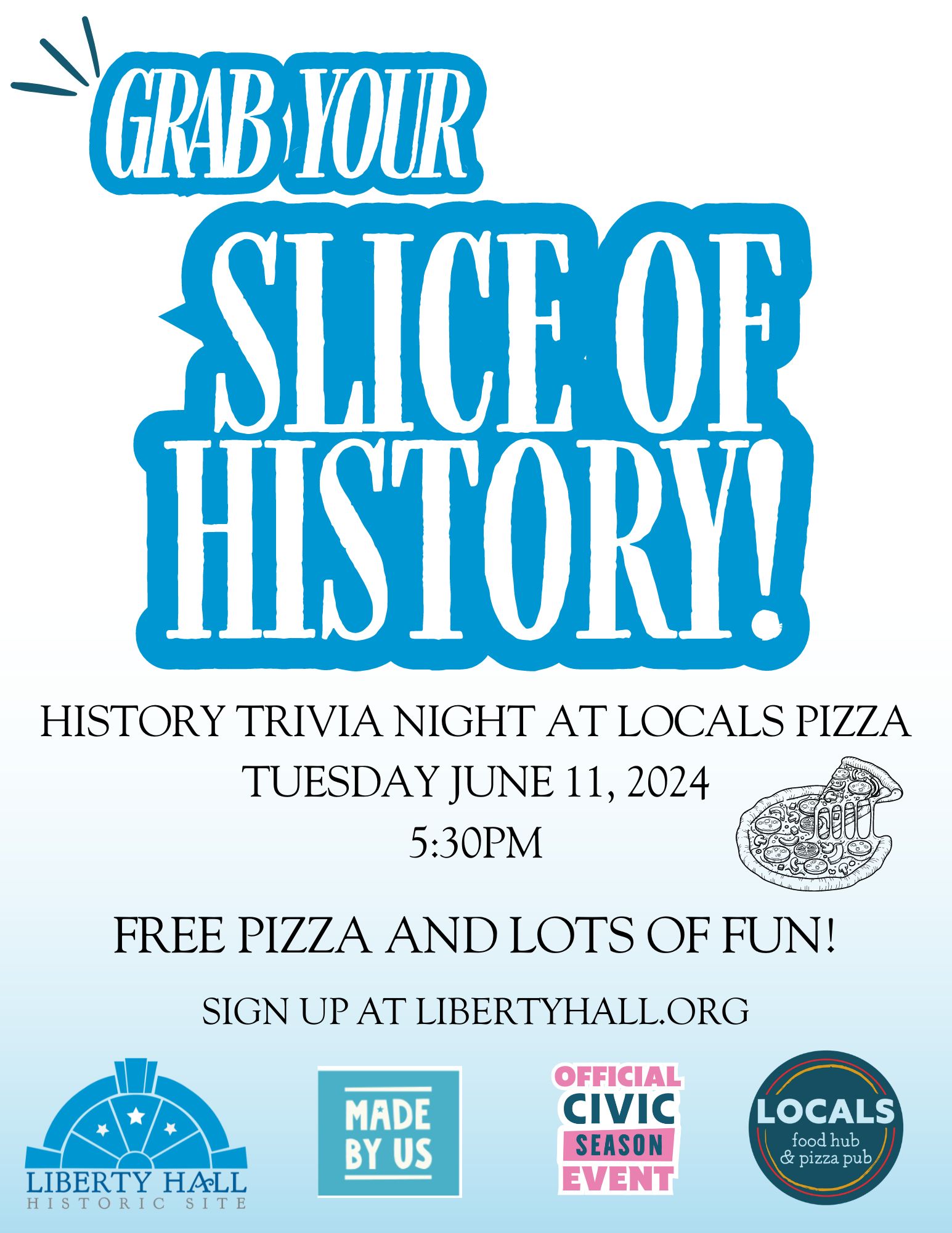 Join Liberty Hall for Kentucky’s Civic Season in an evening of history trivia, food, and prizes! Locals Food Hub & Pizza Pub creates a gathering space where our community & visitors can come together around local food, while Liberty Hall nurtures personal connections to the past as a means of civic engagement. The two partnered together to offer you your own Slice of History, so come on down to Locals for a slice of free pizza and trivia fun!