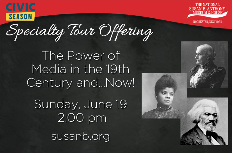 Join the National Susan B. Anthony Museum & House for a specialty tour offering on Sunday, June 19 at 2 pm. The tour will discuss the role of the media in the 19th century and how the legendary American civil rights leader, Susan B. Anthony, carefully curated her public image. The tour also explores the great reformers Frederick Douglass and Ida B. Wells and how they used their words as agents of change. After the tour, we invite you to a round table discussion in our Carriage House.