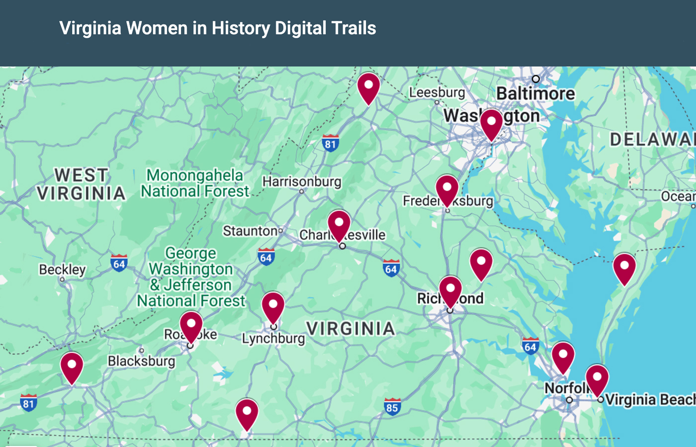 View our regional digital trails to follow in the paths of trailblazing Virginia women who have been honored as one of the Library’s Virginia Women in History.