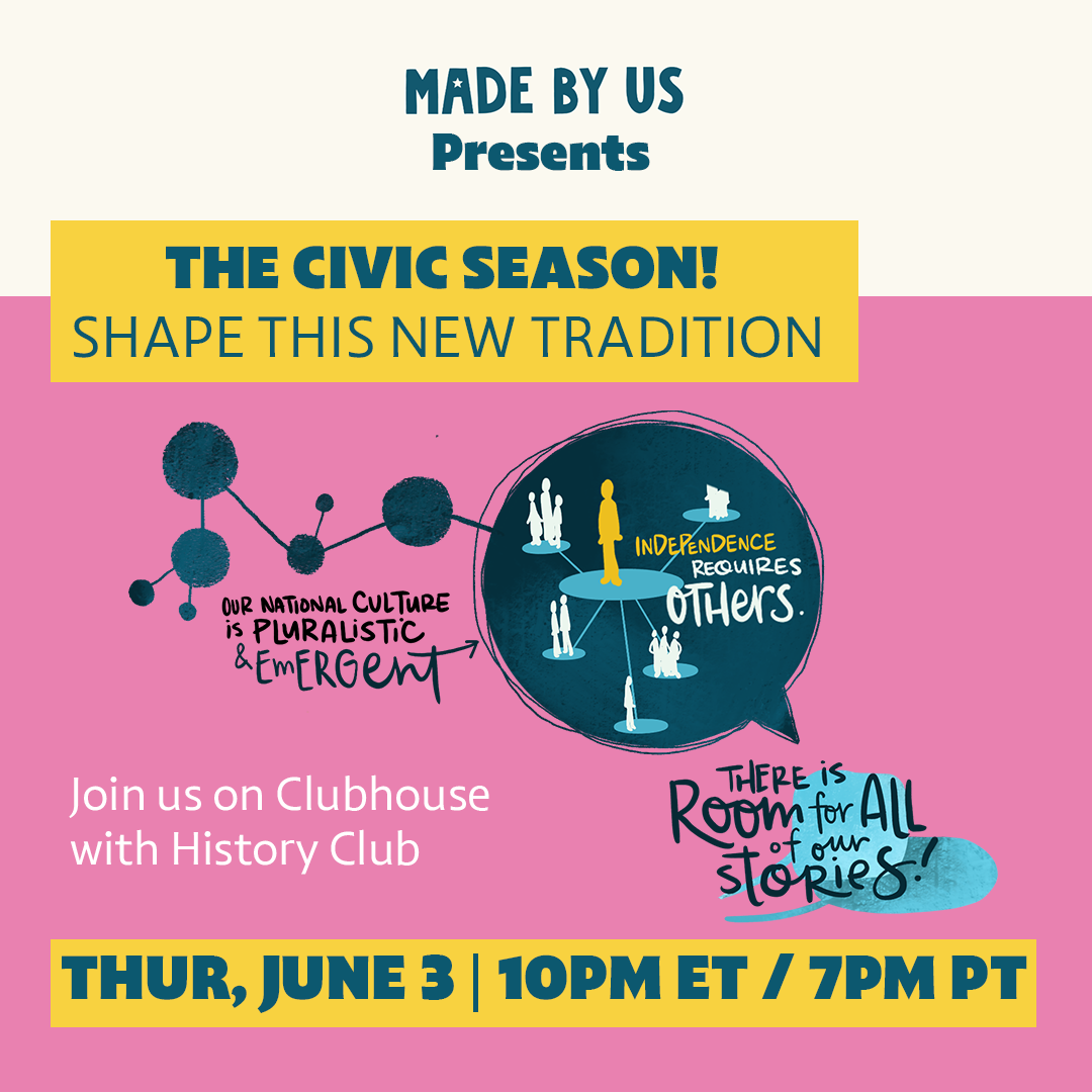 History Club , United StatesJoin Made By Us in History Club, on Clubhouse, to dig deep into what a Civic Season can do and be - and how you can be a part of it. This event was held on June 3, 2021. Check back for the recording at History Club.